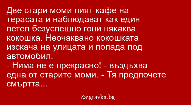 Две стари моми пият кафе на терасата и наблюдават как един петел безуспешно гони някаква кокошка. Неочаквано кокошката изскача на улицата и попада под автомобил.