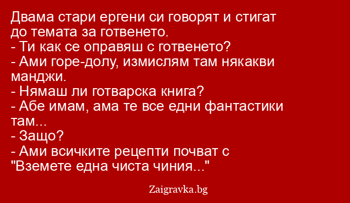 Двама стари ергени си говорят и стигат до темата за готвенето.