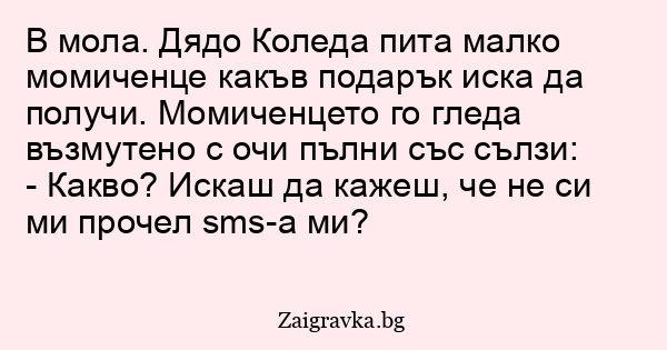 В мола. Дядо Коледа пита малко момиченце какъв подарък иска да получи. Момиченцето го гледа възмутено с очи пълни със сълзи:
