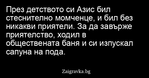 През детството си Азис бил стеснително момченце, и бил без никакви приятели. За да завърже приятелство, ходил в обществената баня и си изпускал сапуна на пода.