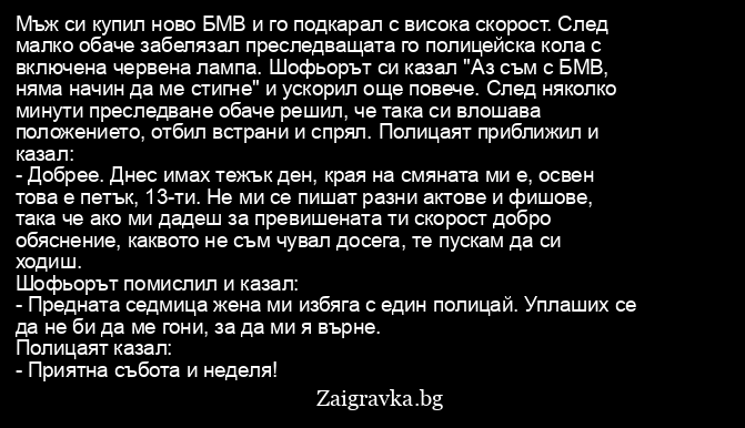 Мъж си купил ново БМВ и го подкарал с висока скорост. След малко обаче забелязал преследващата го полицейска кола с включена червена лампа. Шофьорът си казал "Аз съм с БМВ, няма начин да ме стигне" и ускорил още повече. След няколко минути преследване обаче решил, че така си влошава положението, отбил встрани и спрял. Полицаят приближил и казал: