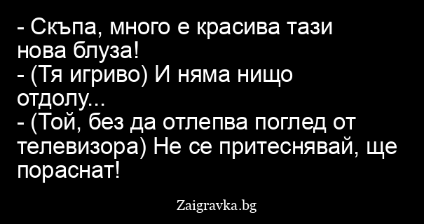 - (Той, без да отлепва поглед от телевизора) Не се притеснявай, ще пораснат!