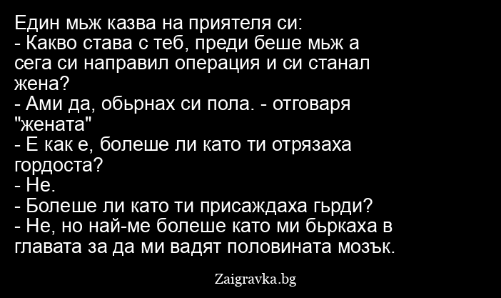 - Какво става с теб, преди беше мьж а сега си направил операция и си станал жена?