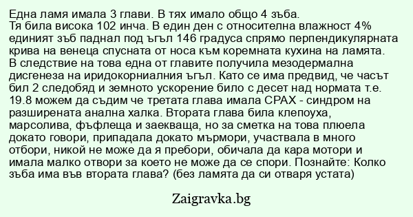Тя била висока 102 инча. В един ден с относителна влажност 4% единият зъб паднал под ъгъл 146 градуса спрямо перпендикулярната крива на венеца спусната от носа към коремната кухина на ламята. В следствие на това една от главите получила мезодермална дисгенеза на иридокорниалния ъгъл. Като се има предвид, че часът бил 2 следобяд и земното ускорение било с десет над нормата т.е. 19.8 можем да съдим че третата глава имала СРАХ - синдром на разширената анална халка. Втората глава била клепоуха, марсолива, фъфлеща и заекваща, но за сметка на това плюела докато говори, припадала докато мърмори, участвала в много отбори, никой не може да я пребори, обичала да кара мотори и имала малко отвори за което не може да се спори. Познайте: Колко зъба има във втората глава? (без ламята да си отваря устата)