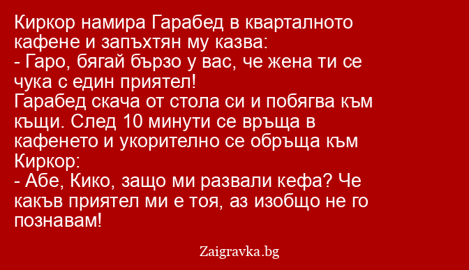 - Гаро, бягай бързо у вас, че жена ти се чука с един приятел!