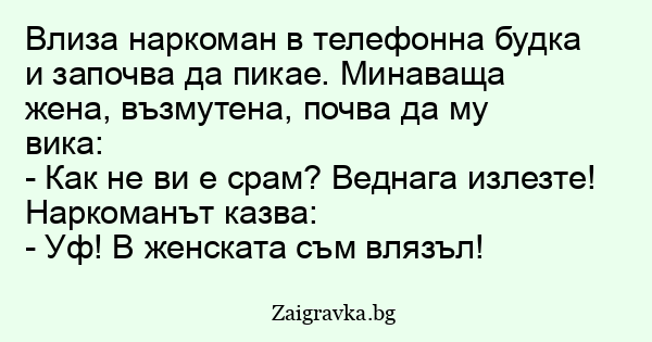 Влиза наркоман в телефонна будка и започва да пикае. Минаваща жена, възмутена, почва да му вика:
