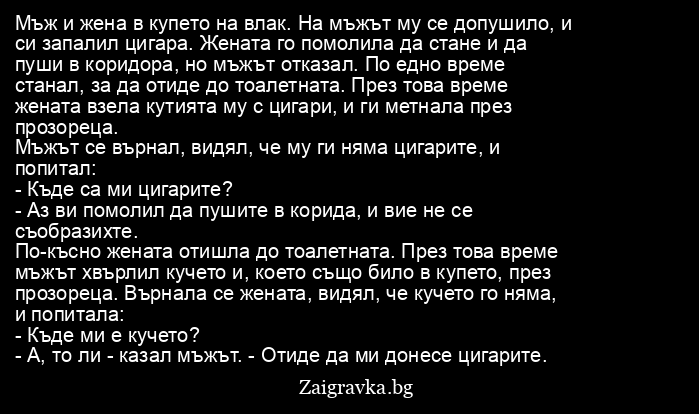 Мъж и жена в купето на влак. На мъжът му се допушило, и си запалил цигара. Жената го помолила да стане и да пуши в коридора, но мъжът отказал. По едно време станал, за да отиде до тоалетната. През това време жената взела кутията му с цигари, и ги метнала през прозореца.
