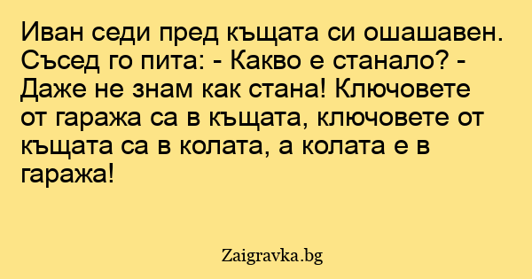 Иван седи пред къщата си ошашавен. Съсед го пита: - Какво е станало? - Даже не знам как стана! Ключовете от гаража са в къщата, ключовете от къщата са в колата, а колата е в гаража!