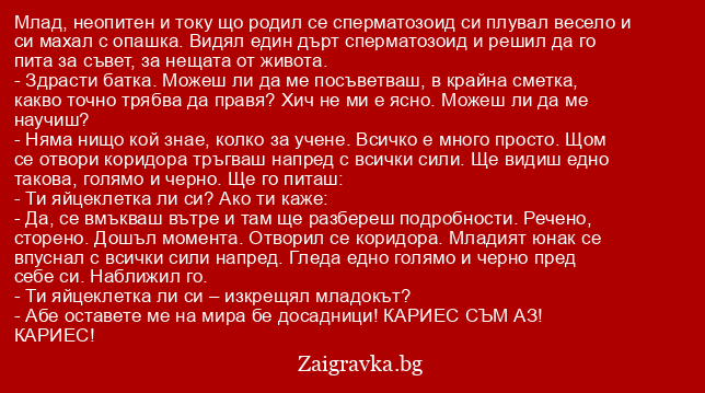 Млад, неопитен и току що родил се сперматозоид си плувал весело и си махал с опашка. Видял един дърт сперматозоид и решил да го пита за съвет, за нещата от живота.