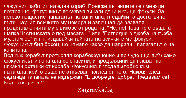 Веднъж корабът претърпял корабокрушение и по чудо (що ли?) само фокусникът и папагала се спасили, и продължили да плават на някакви останки от кораба. Фокусникът гледал злобно към папагала, който също не откъсвал поглед от него. Накрая след седмица папагала не издържал: "Е добре де, добре. Предавам се! Къде е кораба?"