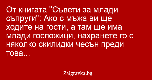 От книгата "Съвети за млади съпруги": Ако с мъжа ви ще ходите на гости, а там ще има млади госпожици, нахранете го с няколко скилидки чесън преди това...
