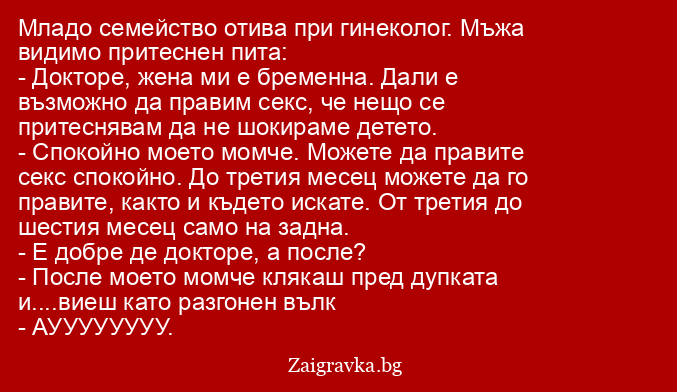 - Спокойно моето момче. Можете да правите секс спокойно. До третия месец можете да го правите, както и където искате. От третия до шестия месец само на задна.