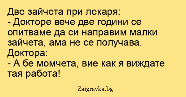 - Докторе вече две години се опитваме да си направим малки зайчета, ама не се получава.