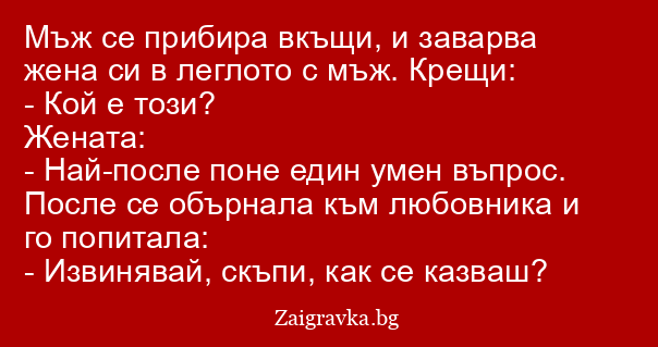 Мъж се прибира вкъщи, и заварва жена си в леглото с мъж. Крещи: