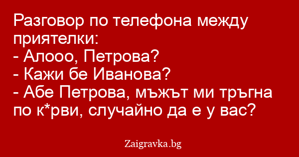 - Абе Петрова, мъжът ми тръгна по к*рви, случайно да е у вас?
