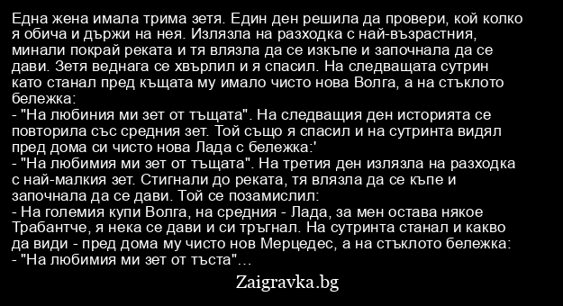 - "На любиния ми зет от тъщата". На следващия ден историята се повторила със средния зет. Той също я спасил и на сутринта видял пред дома си чисто нова Лада с бележка:'