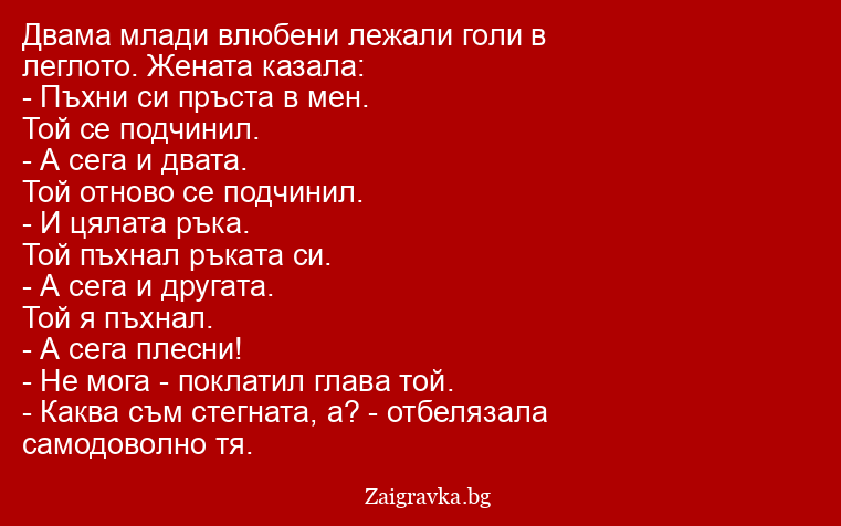 Двама млади влюбени лежали голи в леглото. Жената казала: