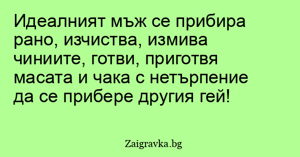 Идеалният мъж се прибира рано, изчиства, измива чиниите, готви, приготвя масата и чака с нетърпение да се прибере другия гей!