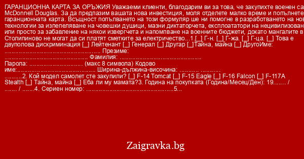 Уважаеми клиенти, благодарим ви за това, че закупихте военен самолет от McDonnell Douglas. За да предпазим вашата нова инвестиция, моля отделете малко време и попълнете гаранционната карта. Всъщност попълването на този формуляр ше ни помогне в разработването на нови технологии за изпепеляване на човешки душици, мазни диктаторчета, експлоататори на нецивилизовани племена или просто за забавление на някои извергчета и напомпване на военните бюджети, докато мангалите в Столипиново не могат да си платят сметките за електричество...1.[_] Г-н. [_] Г-жа. [_] Г-ца. [_] Това е двуполова дискриминация