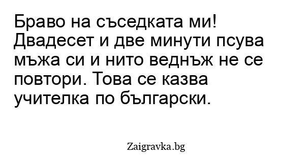 Браво на съседката ми! Двадесет и две минути псува мъжа си и нито веднъж не се повтори. Това се казва учителка по български.