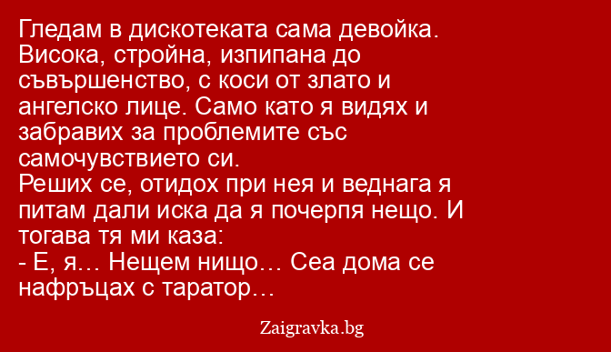 Гледам в дискотеката сама девойка. Висока, стройна, изпипана до съвършенство, с коси от злато и ангелско лице. Само като я видях и забравих за проблемите със самочувствието си.