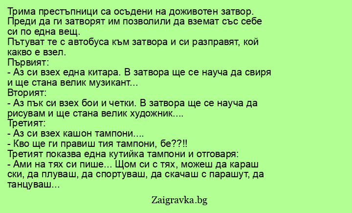 Трима престъпници са осъдени на доживотен затвор. Преди да ги затворят им позволили да вземат със себе си по една вещ.
