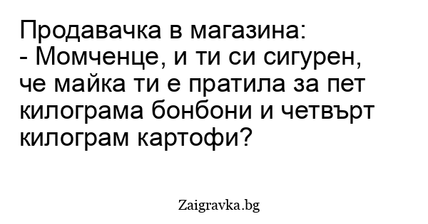 - Момченце, и ти си сигурен, че майка ти е пратила за пет килограма бонбони и четвърт килограм картофи?
