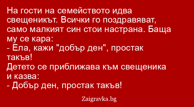 На гости на семейството идва свещеникът. Всички го поздравяват, само малкият син стои настрана. Баща му се кара:
