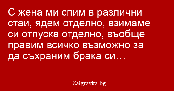 С жена ми спим в различни стаи, ядем отделно, взимаме си отпуска отделно, въобще правим всичко възможно за да съхраним брака си…