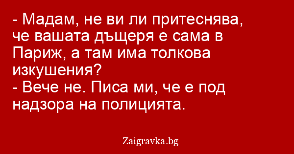 - Мадам, не ви ли притеснява, че вашата дъщеря е сама в Париж, а там има толкова изкушения?