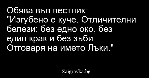 "Изгубено е куче. Отличителни белези: без едно око, без един крак и без зъби. Отговаря на името Лъки."