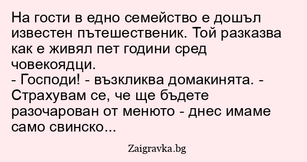 - Господи! - възкликва домакинята. - Страхувам се, че ще бъдете разочарован от менюто - днес имаме само свинско...