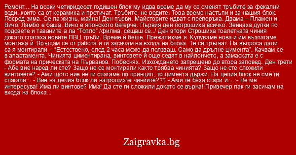Строшиха тоалетната чиния докато слагаха новите ПВЦ тръби. Време й беше. Прежалихме я. Купуваме нова и им възлагаме монтажа й. Връщам се от работа и ги засичам на входа на блока. Те си тръгват. На въпроса дали са я монтирали – “Естествено, след 2 часа може да ползваш. Само да дръпне цимента”. Качвам се в апартамента. Чинията циментирана, винтовете й още седят в найлончето, а замаската е с формата на прическата на Първанов. Побеснях. Изхождането запрещено до втора заповед.