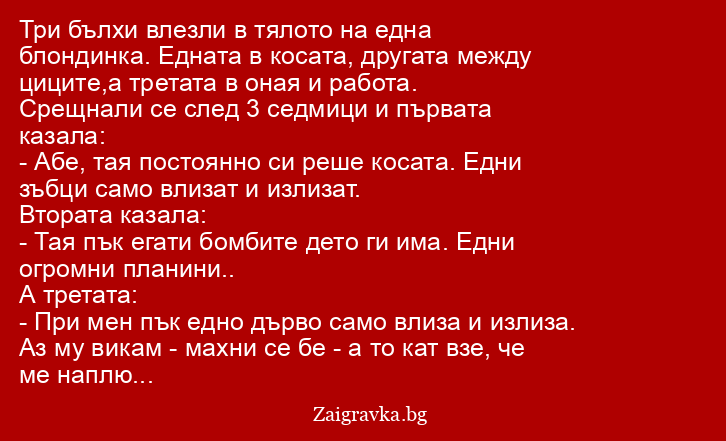 Три бълхи влезли в тялото на една блондинка. Едната в косата, другата между циците,а третата в оная и работа.