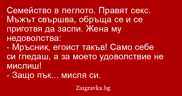 Семейство в леглото. Правят секс. Мъжът свършва, обръща се и се приготвя да заспи. Жена му недоволства: