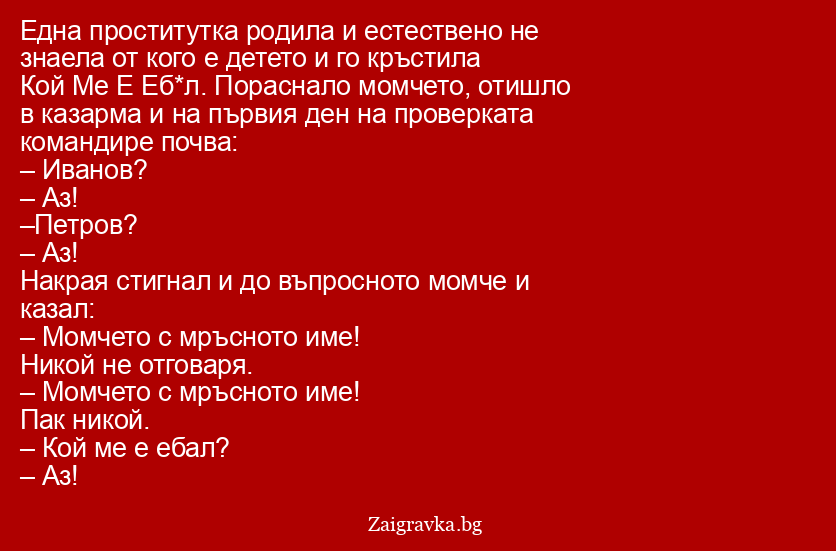 Една проститутка родила и естествено не знаела от кого е детето и го кръстила Кой Ме Е Еб*л. Пораснало момчето, отишло в казарма и на първия ден на проверката командире почва: