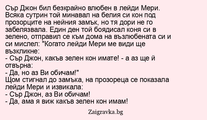 - Сър Джон, какъв зелен кон имате! - а аз ще й отвърна: