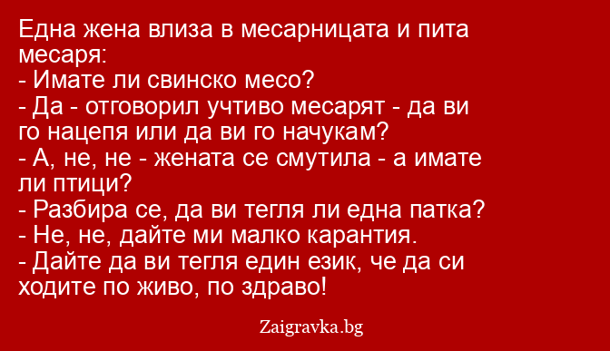Една жена влиза в месарницата и пита месаря:
