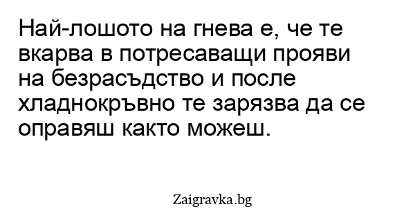Най-лошото на гнева е, че те вкарва в потресаващи прояви на безрасъдство и после хладнокръвно те зарязва да се оправяш както можеш.