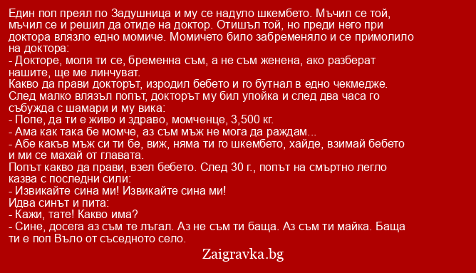 Един поп преял по Задушница и му се надуло шкембето. Мъчил се той, мъчил се и решил да отиде на доктор. Отишъл той, но преди него при доктора влязло едно момиче. Момичето било забременяло и се примолило на доктора:
