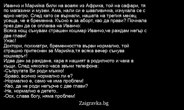 Иванчо и Марийка били на воаяж из Африка, той на сафари, тя по магазини и музеи. Ама, нали си е шавливичка, изчукала се с едно негро. След като се върнали, нашата на третия месец усеща, че е бременна. Късно е за аборт, кво да прави? Почнала през ден да се оплаква на Иванчо: