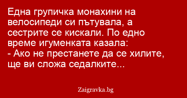 Една групичка монахини на велосипеди си пътувала, а сестрите се кискали. По едно време игуменката казала: