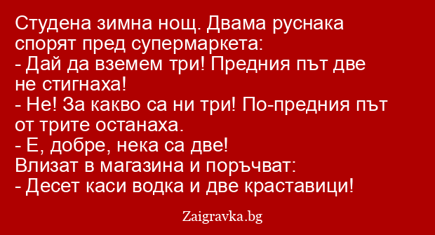 Студена зимна нощ. Двама руснака спорят пред супермаркета: