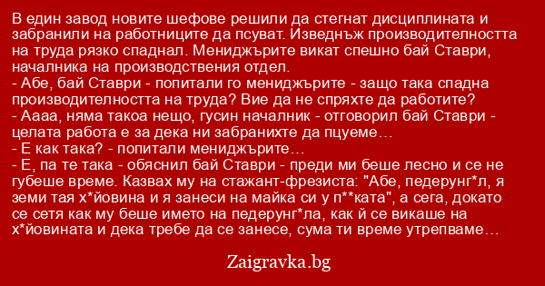 - Абе, бай Ставри - попитали го мениджърите - защо така спадна производителността на труда? Вие да не спряхте да работите?