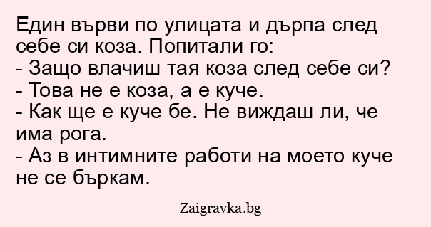 Един върви по улицата и дърпа след себе си коза. Попитали го: