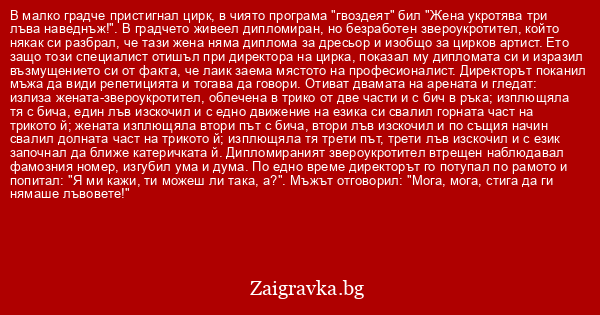 В малко градче пристигнал цирк, в чиято програма "гвоздеят" бил "Жена укротява три лъва наведнъж!". В градчето живеел дипломиран, но безработен звероукротител, който някак си разбрал, че тази жена няма диплома за дресьор и изобщо за цирков артист. Ето защо този специалист отишъл при директора на цирка, показал му дипломата си и изразил възмущението си от факта, че лаик заема мястото на професионалист. Директорът поканил мъжа да види репетицията и тогава да говори. Отиват двамата на арената и гледат: излиза жената-звероукротител, облечена в трико от две части и с бич в ръка; изплющяла тя с бича, един лъв изскочил и с едно движение на езика си свалил горната част на трикото й; жената изплющяла втори път с бича, втори лъв изскочил и по същия начин свалил долната част на трикото й; изплющяла тя трети път, трети лъв изскочил и с език започнал да ближе катеричката й. Дипломираният звероукротител втрещен наблюдавал фамозния номер, изгубил ума и дума. По едно време директорът го потупал по рамото и попитал: "Я ми кажи, ти можеш ли така, а?". Мъжът отговорил: "Мога, мога, стига да ги нямаше лъвовете!"