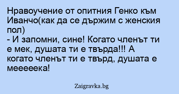 - И запомни, сине! Когато членът ти е мек, душата ти е твърда!!! А когато членът ти е твърд, душата е мееееека!