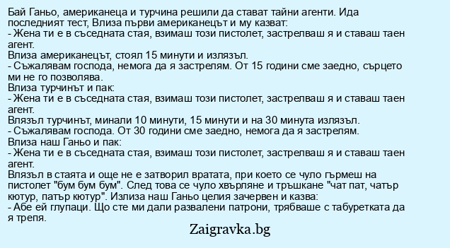Бай Ганьо, американеца и турчина решили да стават тайни агенти. Ида последният тест, Влиза първи американецът и му казват: