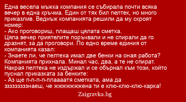 Една весела мъжка компания се събирала почти всяка вечер в една кръчма. Един от тях бил пелтек, но много приказлив. Веднъж компанията решили да му скроят номер: