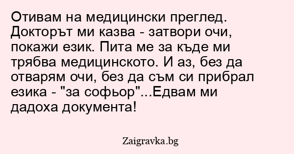 Отивам на медицински преглед. Докторът ми казва - затвори очи, покажи език. Пита ме за къде ми трябва медицинското. И аз, без да отварям очи, без да съм си прибрал езика - "за софьор"...Едвам ми дадоха документа!